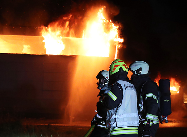 Gestern gegen 23:30 Uhr wurden die Feuerwehreinheiten Kempershöhe und Marienheide zu einem Brand bei der Firma Risse in der Marienheider Straße „Wiesengrund“ durch Brandmeldeanlagen alarmiert. Wie der Heier Wehrchef Frank Hartkopf berichtete, wurden bereits während der Anfahrt die Löschkräfte aus Kalsbach und Müllenbach/Dannenberg sowie die Drehleiter und ein Tanklöschfahrzeug aus Gummersbach nachgefordert. Anwohner hatten sich zwischenzeitlich bei der Leitstelle in Kotthausen gemeldet und von einem „Großbrand“ berichtet. Das sollte sich beim Eintreffen der Feuerwehr bestätigen, eine Produktions- sowie eine Lagerhalle standen in Vollbrand: „Kurz nach unserem Eintreffen zündete das Feuer durch“, berichtete Hartkopf.