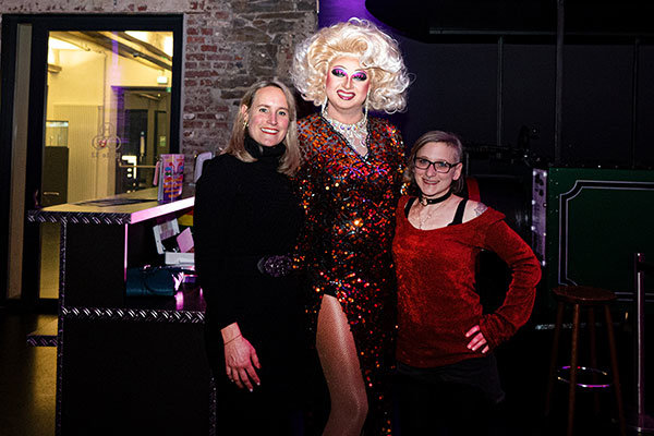 [Gerne ließen sich die Künstler mit den Gästen fotografieren, wie hier mit Sabrina und Aline aus Gummersbach, die sich über das abwechslungsreiche Angebot in Gummersbach - wie die Travestie-Show – freuten.]