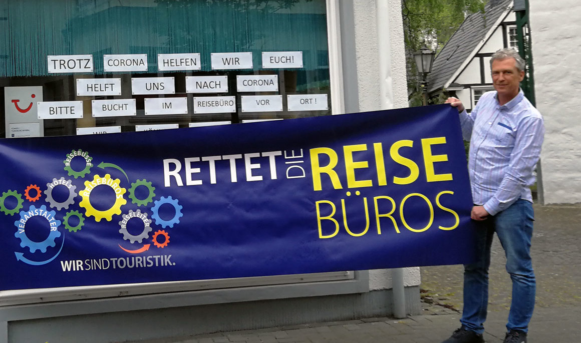 Die Transparente mit klaren Forderungen an die Politik zur Umsetzung für die Reisebranche sind heute bei Stephan Lang aus der Druckerei eingetroffen. Kurzfristig hat der Geschäftsinhaber für eine Demonstration am morgigen Mittwoch auf dem Kölner Roncalliplatz sprichwörtlich die Koffer gepackt und gehört zu jenen 20 Teilnehmern, die sich für weitere Hilfen einsetzen. Obwohl er weiterhin für alle Fragen telefonisch und nach Terminabsprache erreichbar ist, will in Coronazeiten keiner seiner Kunden die Koffer packen, was den Umsatz in seinem Ründerother Reisebüro gen null tendieren lässt.