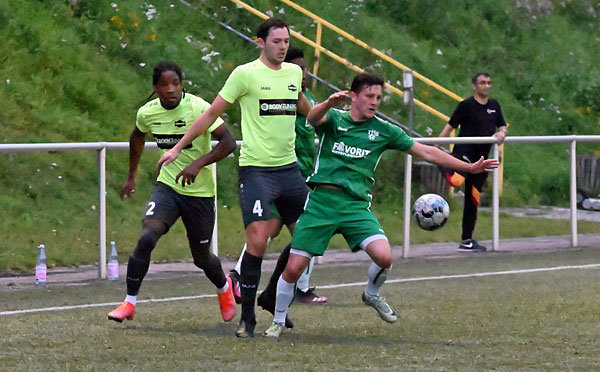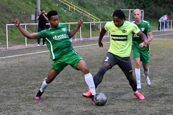 [Der Hohkeppeler Gabriel Mbongo versucht sich gegen Mamadu Jalloh durchzusetzen.]