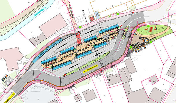 Der Busbahnhof rückt in dem Entwurf dabei hoch Richtung Patschensteg, die Brölbahnstraße läuft dafür nicht mehr geradeaus durch, sonst müsste am Busbahnhof vorbei einen Knick machen. Vorteile: Die Schüler vom Schulzentrum müssten die Brölbahnstraße nicht mehr queren, um zu ihren Bussen zu gelangen. Der Knick habe zudem verkehrsberuhigende Wirkung. Die Busse haben in dieser Variante genug Platz, in der Mitte bietet ein großer Bussteig für die Gäste Raum. Eine Überdachung soll zudem dafür sorgen, dass man nicht nass wird. Generell sei die Gestaltung offener und heller. Auch an eine Toilette für die Busfahrer hat Kraus gedacht.