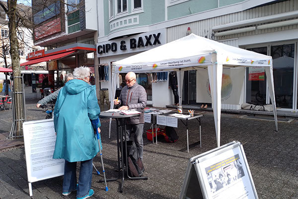 [Foto: Oberberg ist bunt, nicht braun! --- Der Infostand war vor der Adresse Hindenburgstraße 13 aufgebaut.]