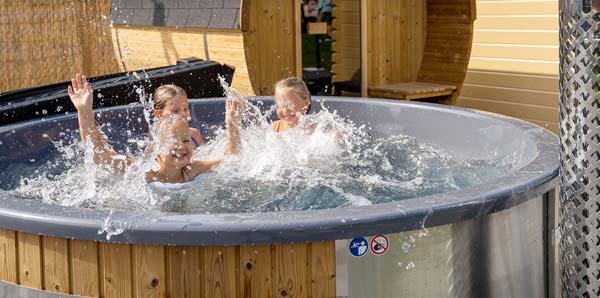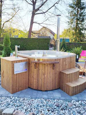 Der jüngste Spross in der Produktpalette ist der Hot Tub CARRÉE. Das quadratische Format ist sowohl mit internem als auch externem Ofen erhältlich und ergänzt die runden und ovalen Hot Tubs um eine weitere edle Variante. Auf Wunsch auch mit goldfarbener Wanne.