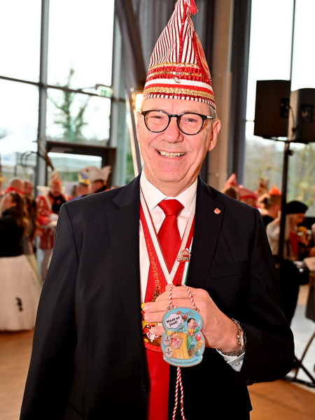 Zwischendurch gratulierte der Landrat Hansi Welter, mittlerweile Ehrenpräsident der KG Rot-Weiß Denklingen, zum erhaltenen Orden „Würdigung des Brauchtums“, der ihm von André Kuper, dem Präsidenten des nordrhein-westfälischen Landtags in Düsseldorf, verliehen wurde. Mit den stellvertretenden Landräten Friedrich Wilke und Tobias Schneider hatte Hagt fleißige Helfer auf der Bühne, die die jeweiligen Gefolge mit dem aktuellen Motto-Orden 2025 versorgten. In diesem Jahr lautet der Spruch darauf „Maat ett joot“ und zeigt einen Landrat , der seinen Hut zieht und dabei aus der „Bütt“ steigt. „Wir werden uns hier und da noch sehen, nur halt in anderer Form“, erklärte der im Herbst scheidende Landrat seinen Gästen.