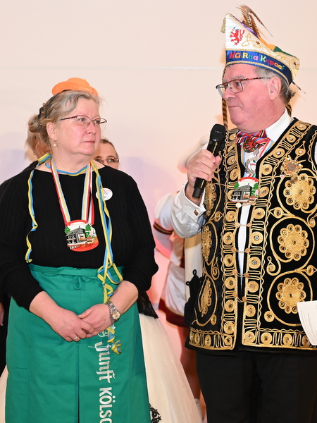 "In den Farben getrennt, in der Sache vereint", kommentierte Bielstein Prinzessin Tina das Zusammentreffen bei deren Auftritt passend. Andrea Eichler-Fliegner von der Kreisverwaltung hatte die Organisation der Veranstaltung übernommen, von den Rader Jecken gab es dafür einen Orden auf der Bühne. Statt Tanz und Liedchen hallten „Salutschüsse“ von den "Hanse Husaren" durch den Sall, als sie Ballons platzen ließen.