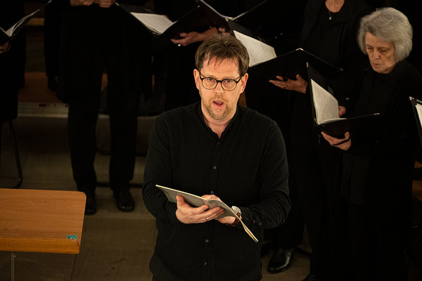[Bariton Arndt Schumacher leitete das Konzert und sang die Jesus-Worte der „Johannes-Passion“.]