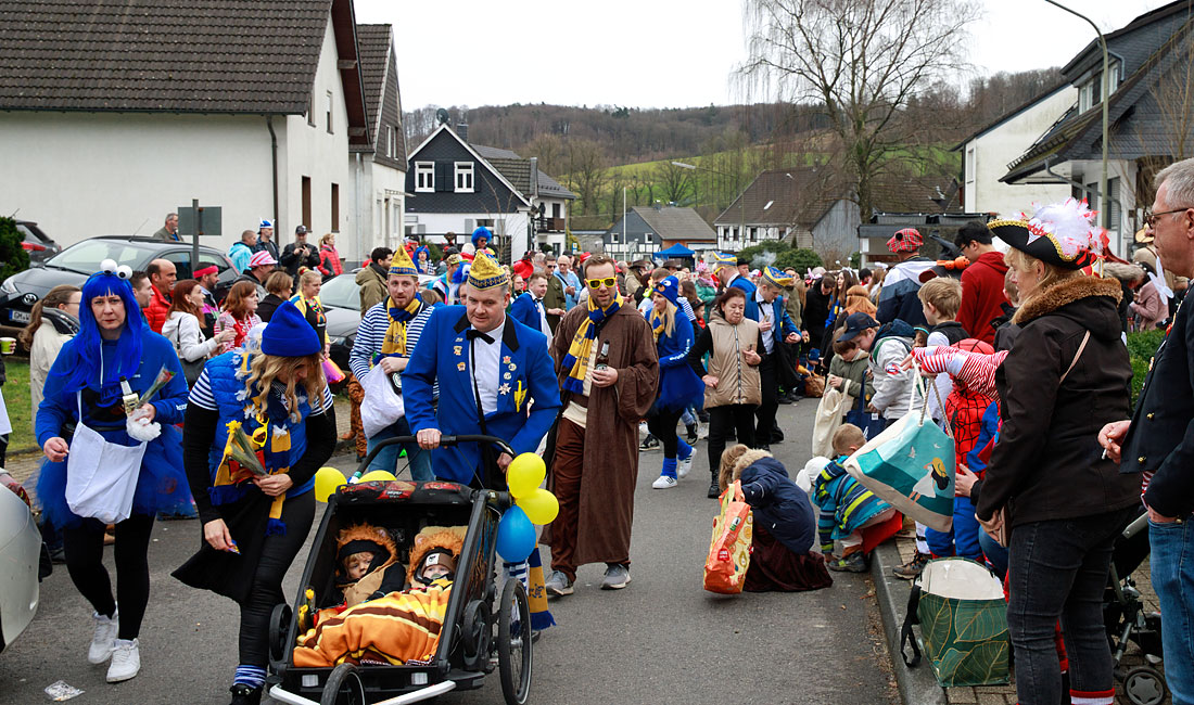 An der Zugstrecke hatte sich auch das Lindlarer Dreigestirn vom KV Rot-Weiß Fenke, Prinz Marcel II., Bauer Michael und Jungfrau Olivia, ein gemütliches Plätzchen gesucht und die Teilnehmer begrüßt. Am Ende folgte der Wagen der KG Sünger Butzen: Blau-Gelb, mit Luftballons geschmückt und einer Fußgruppe von rund 100 kleinen und großen Jecken, die allesamt viel Spaß hatten. Zwischendurch huschte auch immer wieder das Schnapsi-Taxi vorbei und versorgte die erwachsenen Zuschauer auf Wunsch mit einem „Kurzen“. Nach dem Zug ging die große Karnevalsparty natürlich weiter, entweder bei „Edith“ oder in kleiner privater Runde.