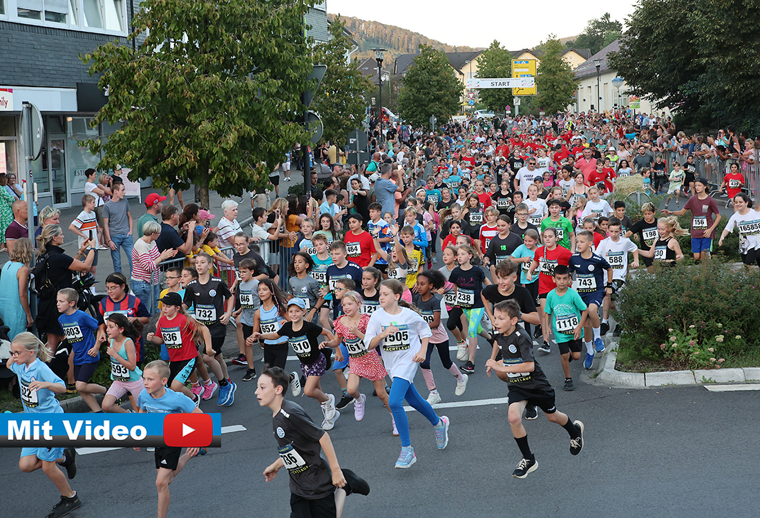 Insgesamt 440 Bambini und fünf junge Nachwuchssportler mit Handicap machten sich auf die 800 Meter lange Wendestrecke in der Bergneustädter Innenstadt. Es gingen jeweils einmal die Kindergartenkinder und einmal die Schulkinder zusammen mit Vorläufer Julian Heisterkamp auf die Runde. Der Athletiktrainer der Handballakademie des VfL Gummersbach hatte damit zu kämpfen, nicht von den Minis überrannt zu werden. Einige tausend Zuschauer sorgten am Straßenrand für eine tolle Stimmung und unterstützten vor allen Dingen die jüngsten Teilnehmer. Auch die sechsjährige Mia hatte sich Unterstützung mitgebracht. „Meine Eltern und meine Omas und Opas haben mich angefeuert“, freute sich die kleine Nachwuchsathletin, die zusätzlich auch von Familienhund Hund Jack Unterstützung erhielt.