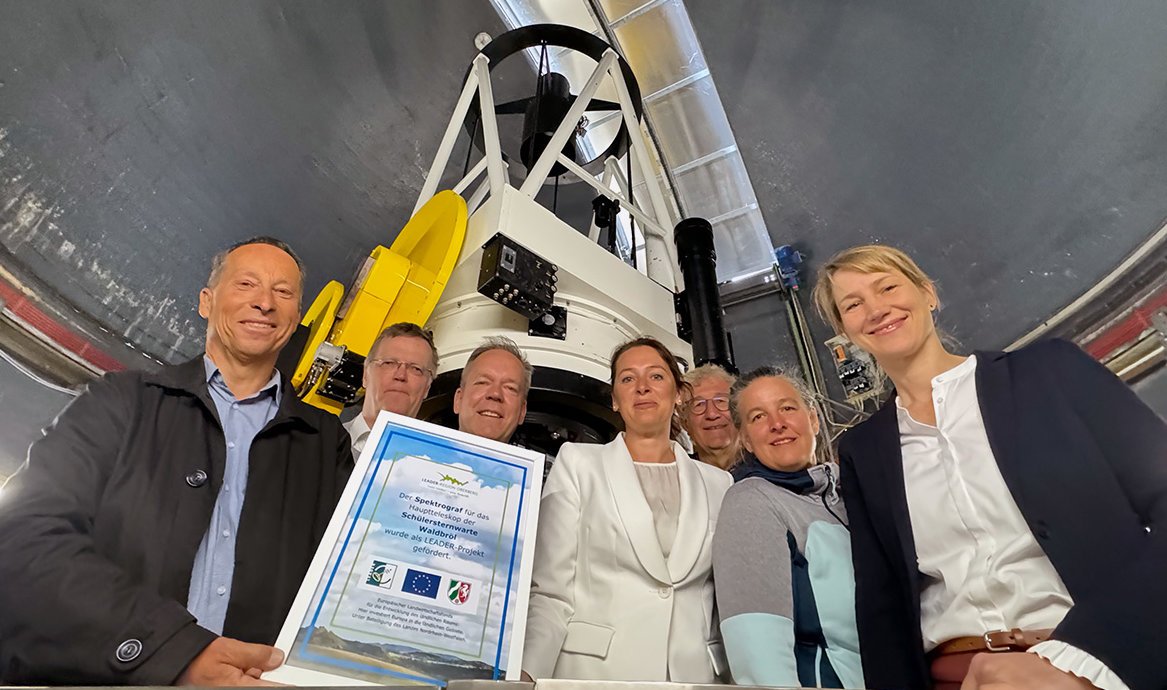 Neben Kreisdirektor Klaus Grotens und Waldbröls Bürgermeisterin Larissa Weber war unter anderem auch Kreisplanungsdezernent Frank Herhaus in den Waldbröler Ortsteil gereist und übergab in seiner Funktion als Vorsitzender der LEADER-Region Oberberg eine Förderurkunde. Knapp 90.000 Euro kostet das Gerät, von dem in Deutschland nur etwa eine Handvoll weiterer Exemplare im Einsatz sind. 65 Prozent, also knapp 57.500 Euro, wurden von LEADER beigesteuert, weitere 20.000 Euro kommen von der Wipperfürther Hans Hermann Voss-Stiftung. 11.000 Euro hat der Verein aus Eigenmitteln beigesteuert. Zwar verfügte man bei der Sternwarte bereits über einen Spektrografen, allerdings konnte man mit diesem nur etwa 15 des 80 Zentimeter Objektivs im Teleskop nutzen.