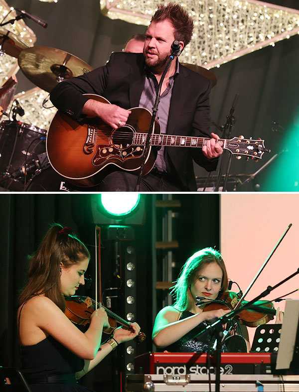 Die "Paveier" ließen sich nicht zwei Mal bitten, die Zuhörer in das Programm mit einzubauen. Jedem Lied ging eine Anekdote von einem Bandmitglieder voraus. So widmeten die Musiker ihr Lied "Nit alle Engel han Flüjel" allen Menschen, die Gutes tun und dabei unbemerkt bleiben. Trotz des Schunkel- und Mitsingverbotes ließen sich die Besucher die gute Laune nicht verderben und klatschten im Takt der Melodie ausgiebig mit. Gemeinsam mit dem Streichquartett "Kwartett Latäng" spielten die kölschen Musiker ihre Songs "Wat dat jot rüch" oder "Bring mich noh Huss".
