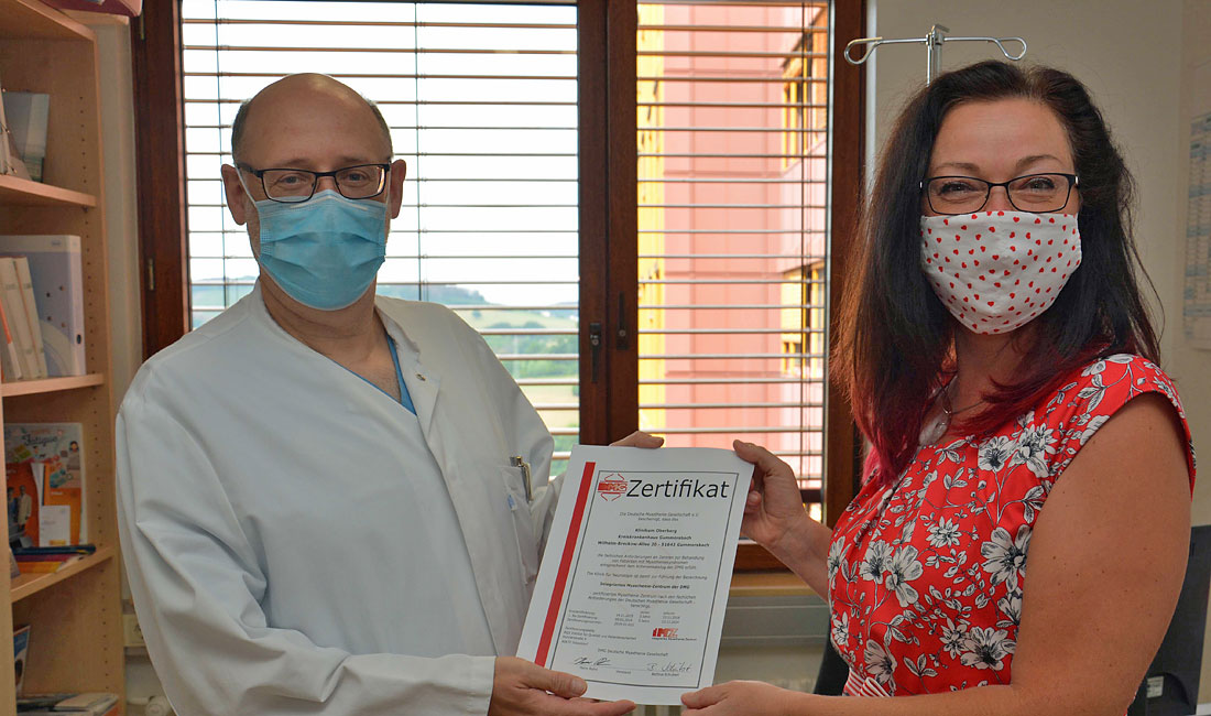 Das Myasthenie-Zentrum am Kreiskrankenhaus Gummersbach ist eins von 40 Zentren weltweit, das sich an einer internationalen Studie zu einem neuen Immunmedikament beteiligt. „Wir freuen uns sehr, als einziges nicht-universitäres Krankenhaus an der Zulassungsstudie teilzunehmen“, sagt Prof. Blaes, Leiter des Myasthenie-Zentrums und Chefarzt der Klinik für Neurologie, der doppelten Grund zur Freude hat. Die Deutsche Myasthenie-Gesellschaft erkennt das Kreiskrankenhaus Gummersbach erneut als zertifiziertes Myasthenie-Zentrum an. Es handele sich um eine der seltenen Zertifizierungen, die durch eine Patienten-Selbsthilfe-Organisation vergeben werde. Die stellvertretende Vorsitzende der Deutschen Myasthenie-Gesellschaft, Claudia Schlemminger, überreichte das Zertifikat an Prof. Blaes.