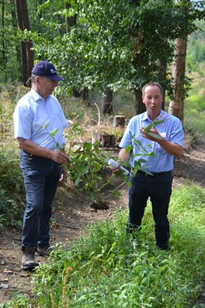 Ein weiterer wichtiger Punkt des Konzepts ist die Naturverjüngung mit der Möglichkeit, später Wirtschaftsbaumarten einzubringen. Die Mischwuchsregulierung ist wichtig, die Zeit der Monokulturen sei vorbei. Exemplarisch zeigte Lang während der Führung immer wieder junge Buchen, Ahorne, Eichen und andere Baumarten, die sich allmählich entwickeln. Auf knapp 33 Prozent der Flächen soll die Renaturierung einer natürlichen Entwicklung überlassen werden. Einzige Ausnahme: Wo eine Beseitigung aus Gründen der Verkehrssicherung und des Brandschutzes unumgänglich ist. Bei der Wiederbewaldung wird zusätzlich besonderer Wert auf die Entwicklung blütenreicher Waldinnenränder und Säume gelegt, um die Insektenvielfalt zu fördern.