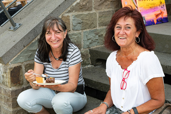 [Miranda Salzmann (re.) aus Wildbergerhütte macht Fotos, hielt ein Schwätzchen mit Nadja Schwendemann, Organisatorin der Kunst-Meile und Objektmanagerin des Kulturbahnhofs, und wird nächstes Jahr mit dabei sein.]