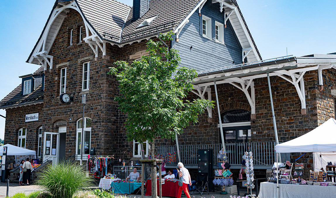 Rund 40 Aussteller hatten sich für die 3. Kunst-Meile rund um den Morsbacher Kulturbahnhof angemeldet. Auch wenn wohl die große Hitze viele Menschen von einem Besuch abgehalten hat, soll es auch nächstes Jahr weitergehen. Nach dreimaliger Durchführung sei es eigentlich Tradition, so Organisatorin Nadja Schwendemann. Die Objektmanagerin für den Kulturbahnhof plant schon und freut sich, dass im nächsten Jahr der Bereich hinter dem alten Bahnhofsgebäude genutzt werden kann, der im Moment im Umbau ist.
