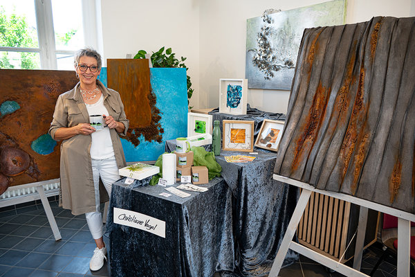 Die Morsbacher Künstlerin Christiane Vogel befand sich mit ihrem Stand im Trauzimmerm dem ehemaligen Wartesaal. Die Erstellung ihrer neuesten Assemblage, die sie neben weiteren Exponaten und den Morsbach-Kaffeebechern und -Aufklebern dabeihatte, konnte man zuvor im Internet verfolgen. Ebenfalls im Trauzimmer drei Künstler aus Erdingen unter dem Motto „Erdingen kreativ“: Mario Plass mit Kunst aus Eisen und Holz, personalisierte Geschenke und Deko von Angela Bottiglieris „Prächtig Jedöns“ und Caren Freudenberg mit abstrakter Kunst. Sie bietet mit ihren LuckysArt auch „Evening Painting Partys unter dem Dach“ an.
