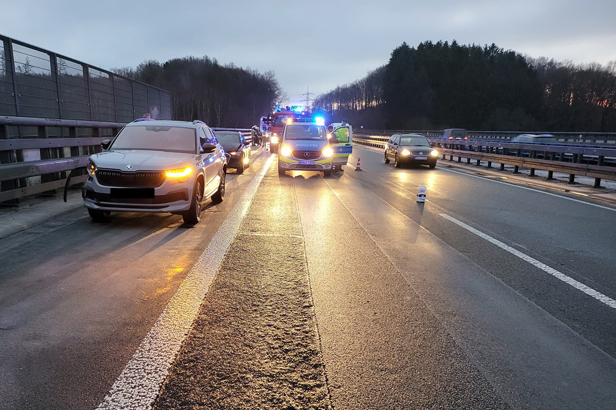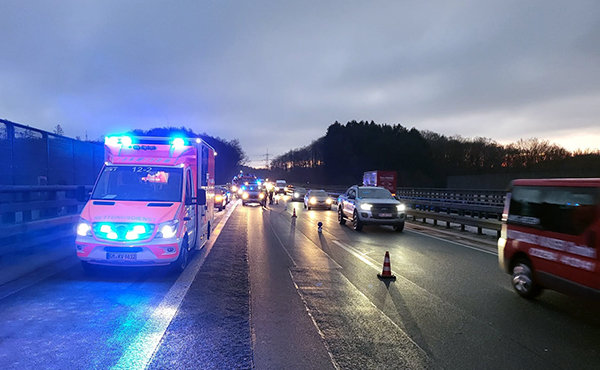 Zunächst war es um 7:15 Uhr in Höhe der Wiehltalbrücke zu einem Auffahrunfall mit drei beteiligten Wagen gekommen. Nach ersten Erkenntnissen der Polizei war die Fahrbahn glatt, ob dies auch zu dem Unfall geführt hat, konnte der Polizeisprecher zunächst aber noch nicht sagen. Die Fahrzeuge konnten durch die beteiligten Autofahrer selbstständig geräumt werden. Zwei Personen wurden nach Angaben der Feuerwehr in Krankenhäuser gebracht, ein 54-Jähriger wurde leicht verletzt. Ein Fahrzeug musste laut Polizei abgeschleppt werden.