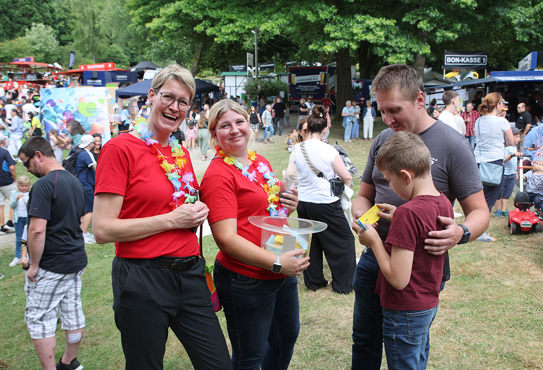 So erfreute sich die Hüpfburg der permanenten Maximalauslastung mit zehn Kindern, lockten Dosen- oder Ringe-Werfen, das Mega-Yenga, die Kegelbahn oder das Minigolf, Kinderschminken, das Bastel- und Kreativzelt oder das aufblasbare Riesen-Darts, vor dem sich eine lange Warteschlange aufgereiht hatte. Klar, denn hier wie auch bei allen anderen Spaßmacher-Angeboten gab es kleine Preise wie Kuscheltiere, Malsets, Bauchtaschen, Kino-Rabattgutscheine oder Gummibärchen zu gewinnen und Gewinner waren ausnahmslos alle, die sich trauten mitzumachen.