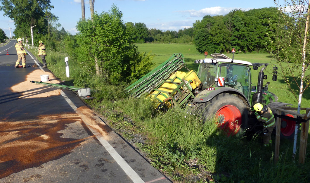 Am Montag war ein 62-jähriger Lkw-Fahrer aus Remscheid auf der B 483 in Richtung Radevormwald unterwegs. Gegen 18:30 Uhr wollte er den vorausfahrenden Traktor eines 33-jährigen Hückeswageners überholen. Beim Überholvorgang stießen die beiden Fahrzeuge zusammen, weil der 33-Jährige zeitgleich nach links in einen Feldweg einbog, teilte die Polizei mit. Durch die Wucht des Aufpralls wurde der Traktor von der Straße geschoben und rollte die Böschung hinab. Laut Polizei erlitt der Remscheider leichte Verletzungen.