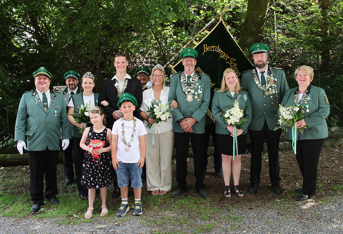 Fast zeitgleich mit dem König wurden am Sonntagnachmittag auch die weiteren Titelträger ermittelt: Den Prinzenvogel sicherte sich Elisa Filker, die mit dem 145. Schuss unter vier Bewerbern erfolgreich war. An ihrer Seite wird Jonas Wagner als Prinzgemahl stehen. Nur wenige Minuten später fiel der Kaiservogel. Tobias Koch, Vater der neuen Kinderkönigin Paulina Koch, setzte sich gegen vier Mitstreiter durch und holte mit dem 121. Schuss den prachtvollen Vogel von der Stange. Gemeinsam mit seiner Frau Stefanie führt er nun als Kaiser das Bernberger Schützenvolk an.