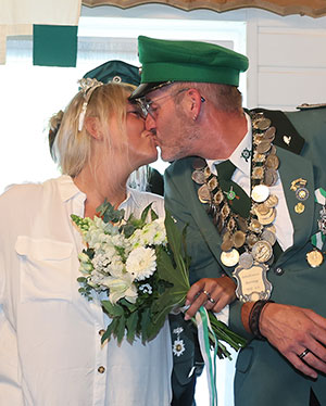 „Ich danke meiner Frau, dass sie das mitmacht. Sie hat sehr mit mir gelitten“, sagte Marx direkt nach seinem Treffer. „Ich bin stolz auf den Verein und froh, den Vogel geschossen zu haben. Ich wünsche uns allen ein tolles Schützenjahr.“ Auch seine Frau Daniela musste die Nerven bewahren: „Ich war mit den Nerven am Ende. Ich habe ehrlich gesagt gar nicht damit gerechnet, dass das so schnell passiert. Jetzt brauche ich erstmal Zeit, um das zu verarbeiten.“