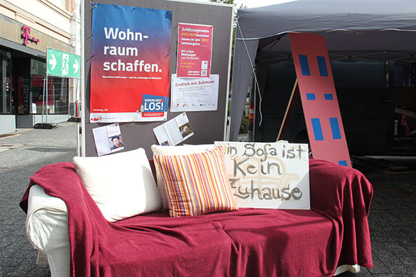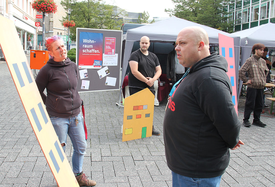Wer nicht eine Minute stehenblieb, um sich die Jongleure anzuschauen, den lockte vielleicht der leckere Waffelgeruch oder die übersichtlich präsentierten Infos zum Thema. Besondere Aufmerksamkeit erzeugten jedoch Karin Gockeln, Alexander Held, Kevin Winkler, Tanja Langhein und Mario Schütz, teils Mitarbeiter bei den Wohnhilfen, teils selbst Betroffene. Sie führten den Passanten anhand eines kleinen Impro-Theaterstücks vor Augen, wie schwierig die Wohnungssuche für die Menschen ist und welchen Diskriminierungen sie ausgesetzt sind. Mario Schütz gab den Wohnungssuchenden, der nacheinander abgespeist wird von den potenziellen Vermietern – sei es, weil er zum Jobcenter muss oder Zweifel an seinen finanziellen Mitteln bestehen. Er wird aber auch aufgrund seines Äußeren angegangen. Auch wenn die Situation heute auf dem Lindenplatz gespielt war – die Antworten kommen aus realen Begegnungen, so Karin Gockeln, die den Mut jedes einzelnen Teilnehmers lobte.