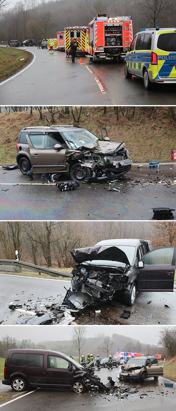 Bei einem Frontalzusammenstoß zweier Autos auf der B 55 zwischen Pernze und Wegeringhausen sind vier Menschen schwer verletzt worden. Gegen 12 Uhr fuhr ein 68-jähriger Mann mit einem VW in Richtung Bergneustadt. Er geriet auf die Gegenfahrbahn, wo es zur Kollision mit dem Skoda eines 19-Jährigen, in dessen Wagen zwei weitere Personen (51 und 53 Jahre) saßen, kam, teilte die Polizei mit. Die Verletzten wurden mit Rettungswagen in umliegende Krankenhäuser gebracht. Die Bundesstraße musste während der Unfallaufnahme für mehrere Stunden gesperrt werden. Neben dem Rettungsdienst waren auch Mitglieder des Löschzugs Dörspetal vor Ort. Ein VU-Team der Polizei wurde ebenfalls angefordert.