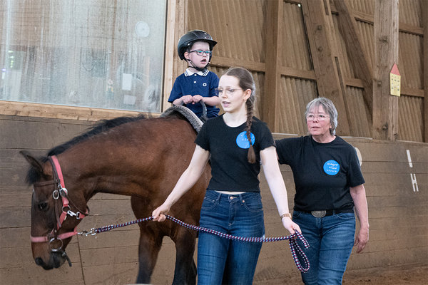 [Der kleine David ist ganz begeistert von der Pferdetherapie auf Juli und wurde von Anna Wilken und Hildegard Kramer (re.) geführt.]
