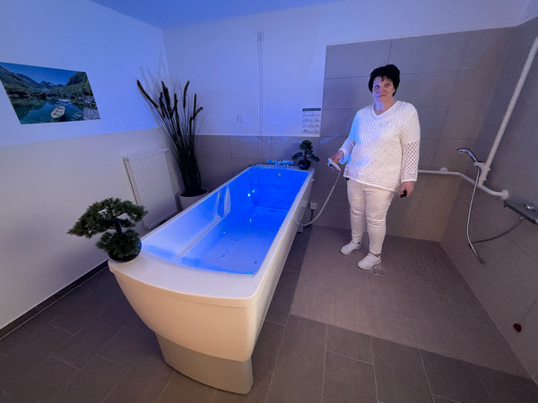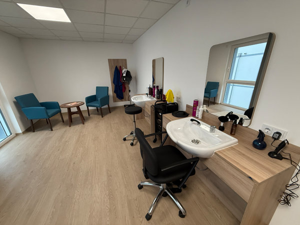 Dort bietet bislang lediglich eine Friseurin in einem eigens gestalteten Salon ihre Dienstleistungen an und das LED-Wellnessbad kann bereits von den derzeit 34 Bewohnern gebucht werden. Die Fertigstellung der dortigen Küche sowie der Gemeinschaftsbereiche sowie der Einzelzimmer soll in den kommenden Wochen abgeschlossen werden. Tritt man auf einen der Balkone, eröffnet sich der Blick auf einen großen Pavillon im Innenhof.