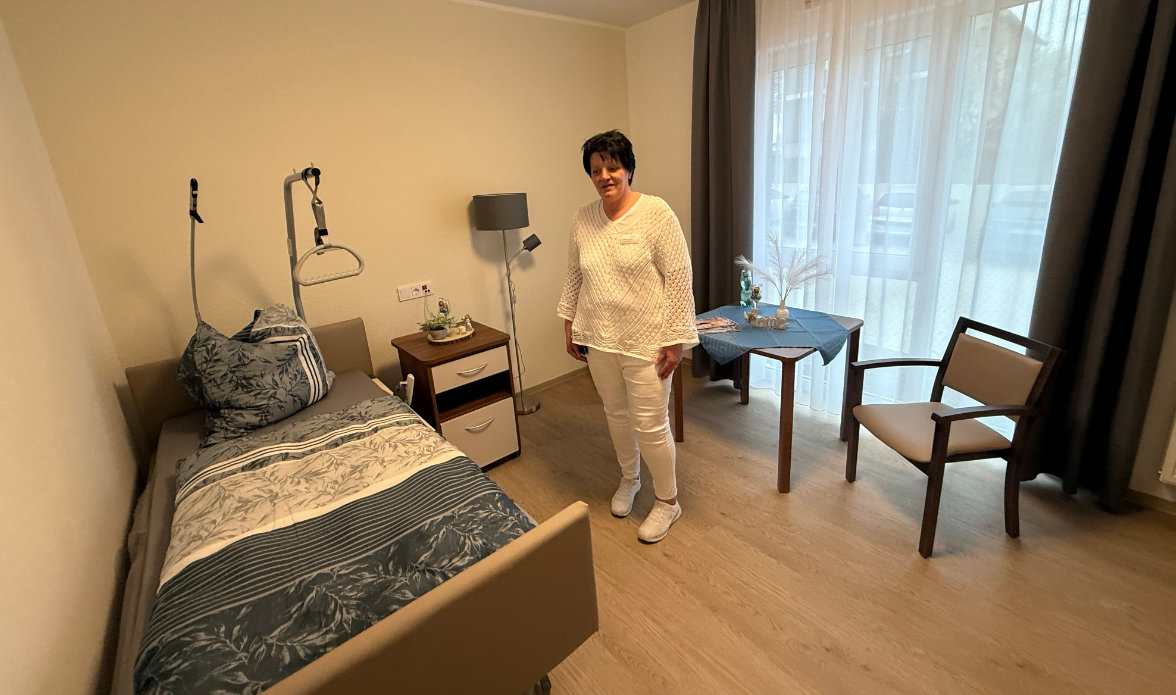 Nicht nur beim Ambiente setzt das Unternehmen von ihrer Ulmer Zentrale aus auf Regionalität. Einrichtungsleiterin Gabriele Krampe stammt aus Bergneustadt und sammelte ihre Berufserfahrung als Führungsperson bei unterschiedlichen Einrichtungen im Kreisgebiet. Im vergangenen April nahm sie an einem offenen Bewerbertag von "compassio" teil und war vom Konzept so überzeugt, dass sie sich kurzum bewarb. Im Oktober hatte sie ihren ersten Arbeitstag. „Wir haben hier wirklich jedes Möbelstück reingeschleppt“, sagt sie rückblickend. Das Haus sei ihr auch deswegen schnell ans Herz gewachsen. Inzwischen kennt sie alle der 80 Pflegezimmer aus dem Effeff, obwohl das Obergeschoss noch nicht bezogen wurde.
