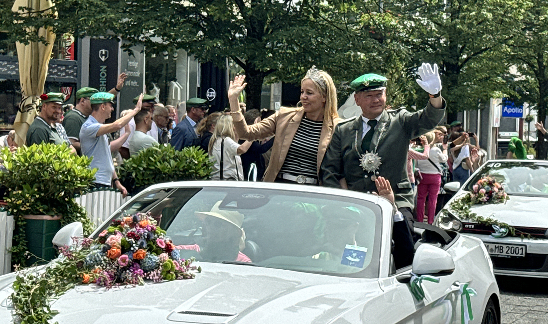 Gemeinsam mit weiteren Fahrzeugen war man bereits am frühen Morgen in Richtung Hardt-Hanfgarten aufgebrochen, um in der dortigen Schützenhalle zu frühstücken. Am Mittag machte sich die Eskorte zurück auf den Weg ins Stadtzentrum, wo der Tross von Hunderten Schaulustigen begeistert empfangen wurde. Vor dem Brauhaus gab es zünftige Klänge vom Musikzug der Feuerwehr Marienheide, etliche Menschen säumten bereits am Vormittag die Kaiser- und Hindenburgstraße. Neben dem Königspaar Ingo und Tanja Lütke winkten die Teilnehmer aus den rund 30 grün-weiß geschmückten Fahrzeugen in die Menge. Von den Ladeflächen der Lastwagen klang zudem laute Partymusik. Die traditionelle Korsofahrt endete schließlich an der Schützenburg.