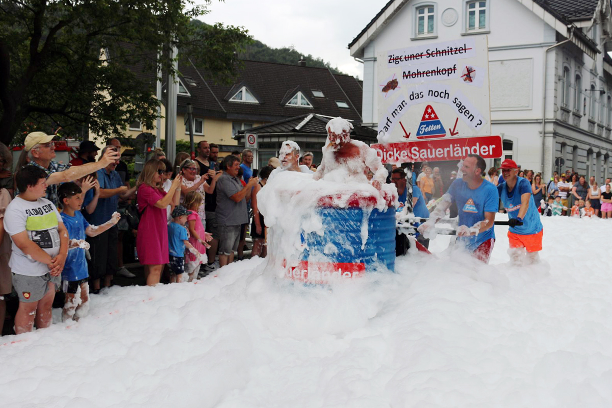 Mit einer leeren Schubkarre, in gefiederter Narrenkappe und Badeschlappen warb seine Tollität Prinz Markus I. aus dem Hause Held, um einen Nachfolger im Amt. Die „Kappesjesichter“ zogen mit einer als Würstchendose umfunktionierten Regentonne gegen die aktuelle Debatte um vermeintlich diskriminierenden Sprachgebrauch ins Feld. Als „Dicker Sauerländer“, wurstfarben geschminkt und mit typischem Zipfel auf dem Kopf, rollte Sebastian Hoberg, in der originalgetreuen Wurstkonserve, angetrieben mit Hilfe seiner sechs „Fetten“ („nicht zu verwechseln mit ähnlich klingenden Herstellern“) durch das begeistert applaudierende Zuschauerspalier.