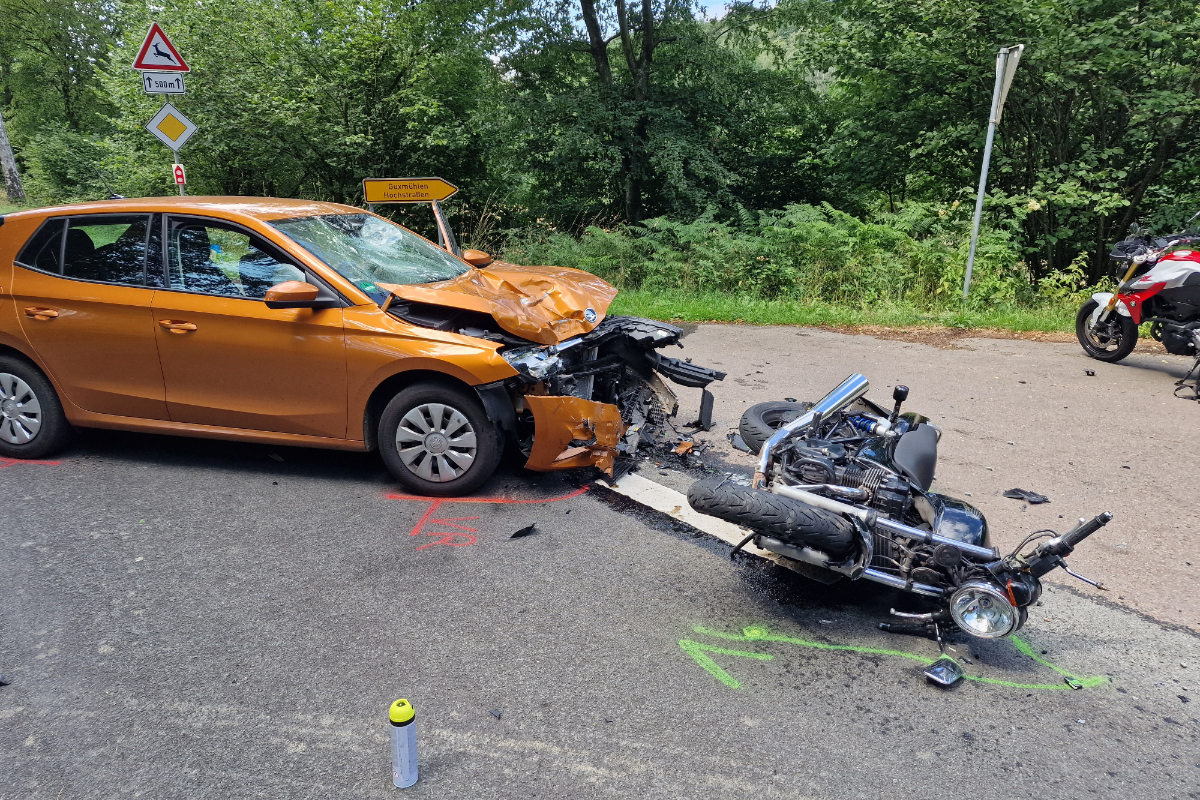 In akuter Lebensgefahr schwebt ein 43-jähriger Wuppertaler, der in Höhe der Nümbrechter Ortschaft Guxmühlen auf der L 339 mit einem Skoda kollidierte. Wie die Polizei mitteilt, wollte eine 55-jährige Nümbrechterin gegen 11:45 Uhr nach Guxmühlen abbiegen und übersah dabei vermutlich den entgegenkommenden Kradfahrer, der mit voller Wucht gegen das Fahrzeug prallte. Der Schwerstverletzte wurde nach der Erstversorgung mit dem Rettungshubschrauber in die Klinik nach Köln-Mehrheim geflogen. Die Autofahrerin wurde leicht verletzt und erlitt einen Schock. Ein zweiter Motorradfahrer, der mit dem Verunglückten unterwegs war, konnte noch rechtzeitig stoppen. An den Fahrzeugen entstand erheblicher Sachschaden, sie mussten abgeschleppt werden. Zur Sicherung der Unfallspuren zog die Polizei das Unfallaufnahmeteam aus Neuss hinzu.