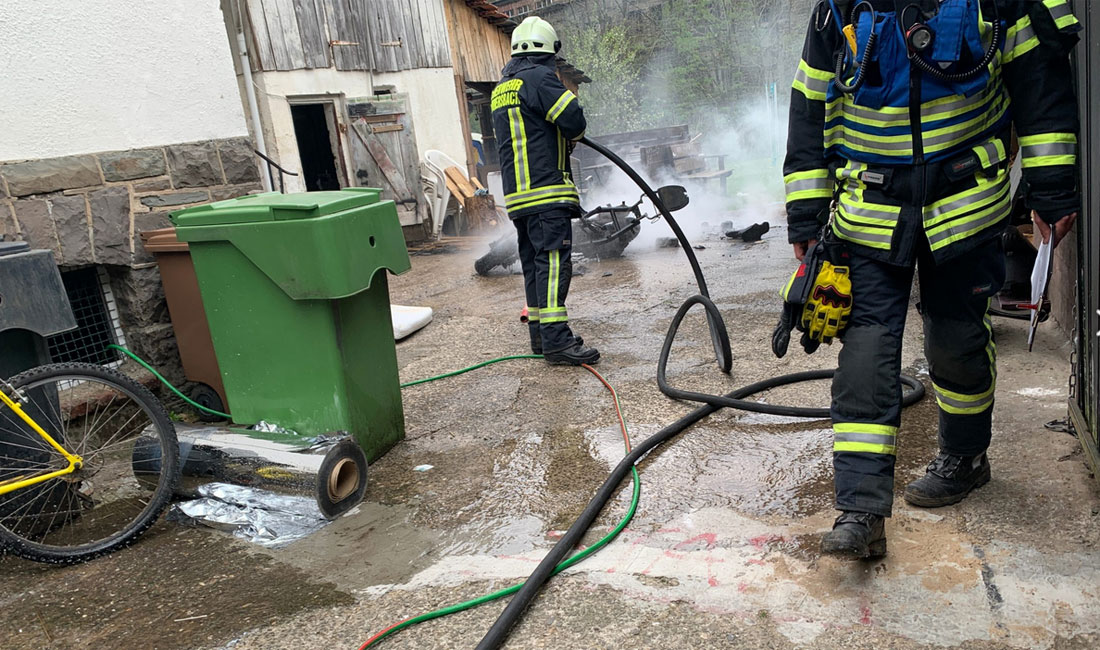 Im Hof eines Hauses in der Aggertalstraße in Dümmlinghausen ist heute Nachmittag bei Reparaturarbeiten ein Moped in Flammen aufgegangen. Mitglieder der Löschgruppen Bernberg und Dümmlinghausen sowie die hauptamtlichen Kräfte aus Gummersbach waren binnen kurzer Zeit vor Ort und konnten die Flammen, die sich bereits auf in einem Schuppen gelagertes Kaminholz ausgebreitet hatten, unter Kontrolle bringen, ohne dass ein größerer Schaden entstand. Laut Feuerwehr hatten zwei Menschen bei eigenen Löschversuchen Rauchgase eingeatmet und wurden vom Rettungsdienst betreut.