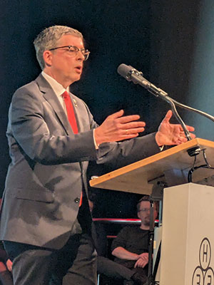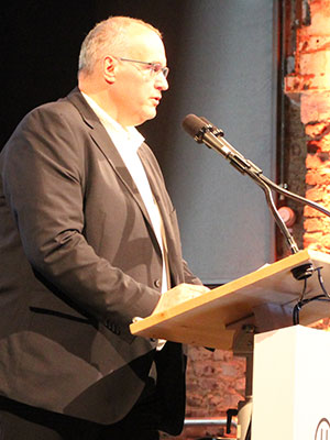 Die Leidenschaft für den VfL steht auch stellvertretend für die Leidenschaft für die Region, für die Oberberger, für die Vereine und Institutionen hier, die Grebe mit der Sparkasse über die Jahre unterstützt hat, woran auch Frank Helmenstein, ehemaliger Bürgermeister von Gummersbach und Verwaltungsratsvorsitzender der Sparkasse (Foto), erinnerte. Grebe zum Sparkassenchef zu machen, sei eine seiner besten Entscheidungen gewesen. Denn wie auch ein Heiner Brand, der ebenfalls Gast in der Halle 32 war, sei Grebe ein „Tiefwurzler“. Mit seinen Fähigkeiten hätte der Gummersbacher auch andere berufliche Möglichkeiten gehabt. Doch er sei in seiner Heimat geblieben. „GM, das heißt auch: ‚Grebe macht‘, ‚gerne mehr‘ oder ‚great mission‘“, sagte Helmenstein. Ohne Grebe und seinen Finanzierungsideen wäre zum Beispiel das Steinmüllergelände nie so zur Erfolgsgeschichte geworden. Es sei ein Privileg gewesen, mit ihm zusammenarbeiten zu dürfen. „Dies ist eine Liebeserklärung von Freund zu Freund.“