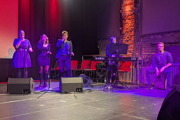 [Die Stone Street Voices sorgten für die passende Musik (oben). Moderator Christian Schmidt (unten, v.li.) im lockeren Gespräch mit Ulrich Voigt, Vorstandsvorsitzender der Sparkasse KölnBonn, Saskia Lagemann, Verbandsgeschäftsführerin des RSGV, und Thomas Pennartz, Vorstandsmitglied der KSK Köln.]