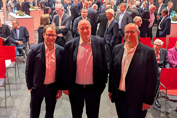 [Frank Grebe (Mitte) gemeinsam mit Gunter Derksen (li.), ab Januar neues Vorstandsmitglied der Sparkasse Gummersbach, und Dirk Steinbach, der Grebe ab dem neuen Jahr als Sparkassenchef beerben wird.]
