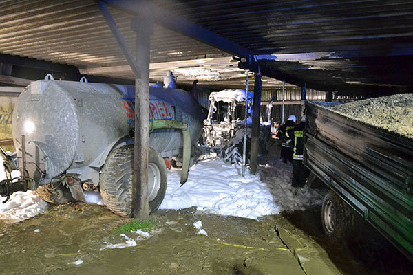 [Archivfoto: Björn Loos --- Auf einem Bauernhof in Kempershöhe brannte im Dezember 2022 ein Traktor aus. Die Feuerwehr Marienheide war mit 70 Kräften vor Ort, unter ihnen Michael Beyer, der sich schwer verletzte.]