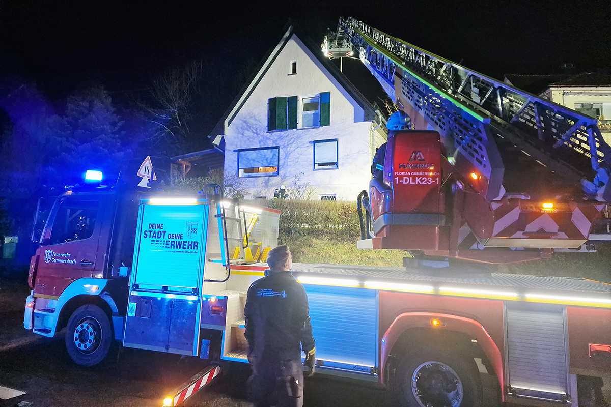 Das ging noch einmal glimpflich aus. Aufmerksame Nachbarn hatten am Sonntagabend der Leitstelle einen Kaminbrand gemeldet und zudem die Anwohner in dem Einfamilienhaus gewarnt. Gegen 20:03 Uhr war die Feuerwehr zu dem Rußbrand in die Straße „Im Sohl“ am Steinberg alarmiert worden. Beim Eintreffen der ersten Einsatzkräfte schlugen bereits Funken aus dem Schornstein, sagte Einsatzleiter Simon Mecke vor Ort. Die etwa 20 Feuerwehrleute der Hauptamtlichen Wache und des Löschzugs Gummersbach bauten sofort eine Wasserversorgung auf und schickten einen Trupp mit der Wärmebildkamera in das Gebäude.
