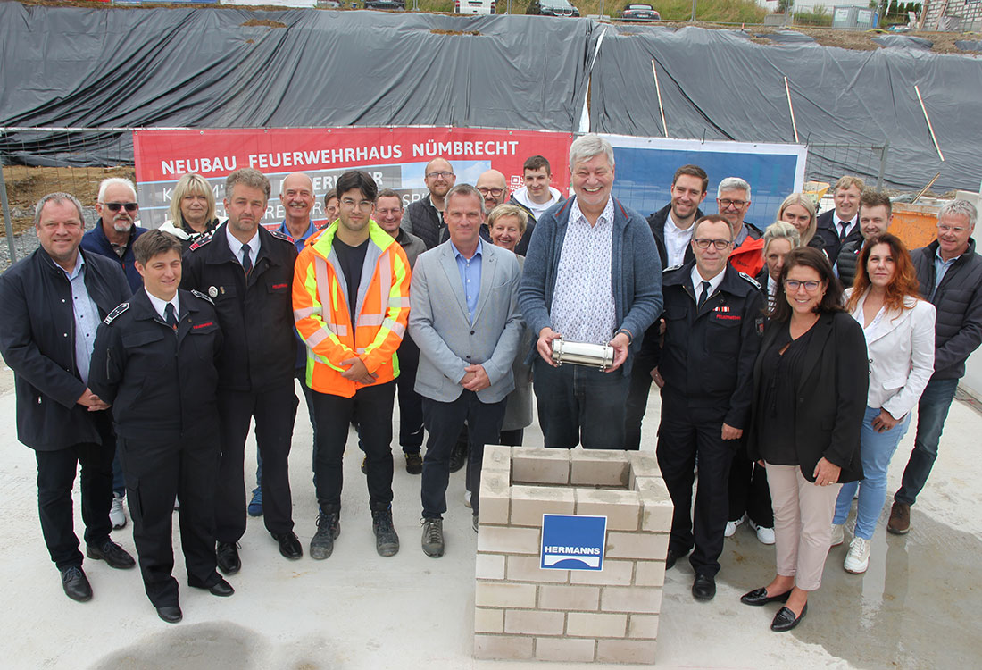 Nümbrecht – Grundsteinlegung für die neue Hauptwache in Nümbrecht – Fünf Millionen Euro nimmt die Gemeinde in die Hand – Mitte 2025 soll der Bau fertig sein.