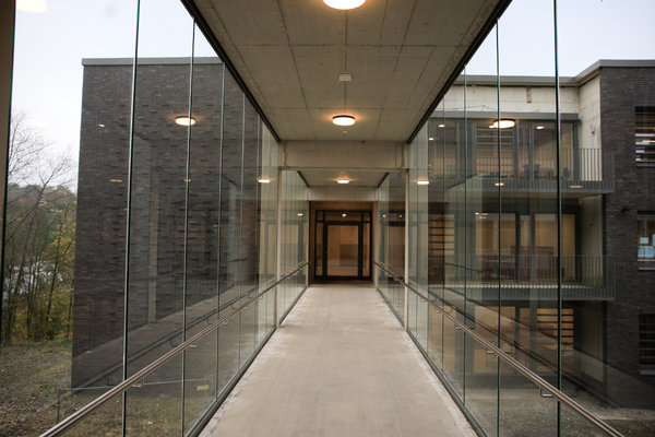 [Der lichtdurchflutete Übergang ins neue Schulgebäude.]