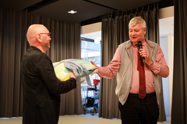 [Nümbrechts Bürgermeister Hilko Redenius (re.) überreichte dem Schulleiter der Sekundarschule, Helmut Müller, symbolisch ein Kissen.]