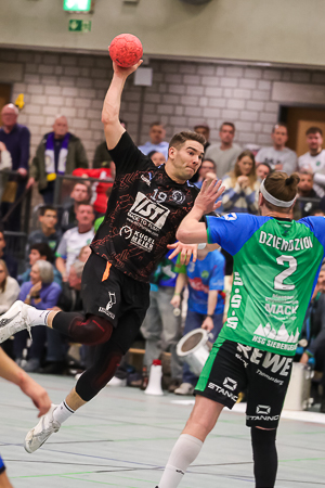 Mit 5:3 führten die Gäste in der prall gefüllten GWN-Arena - auch die Gäste hatten eine ansehnliche Gruppe Fans im Gepäck, die zur Atmosphäre ihren Teil beitrugen - ehe die Hausherren ins Spiel kamen. Dank einer starken Abwehrleistung zog man schnell auf 9:7 vorbei (15.) und ging über 14:10 (26.) mit zwei Toren Vorsprung in die Pause. Zwischenzeitlich hatte Seinsche die 6:0-Deckung auf eine 5:1-Abwehr umgestellt und Tobias Schröter in vorderster Front verteidigen lassen, um dem Gegner „das Offensivspiel kaputt zu machen“, erklärte Seinsche. So wirklich griff die Maßnahme erst nach der Pause.