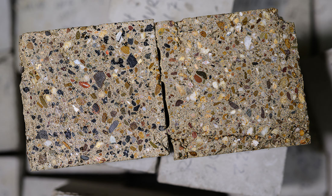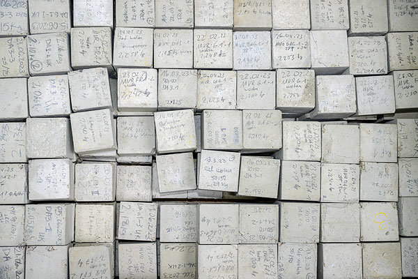 [Es wurden Probekörper aus Beton hergestellt, bei denen im Vergleich zu Standardrezepturen etwa die Hälfte des darin enthaltenen Kieses durch aufbereitete MV-Asche ersetzt wird.]