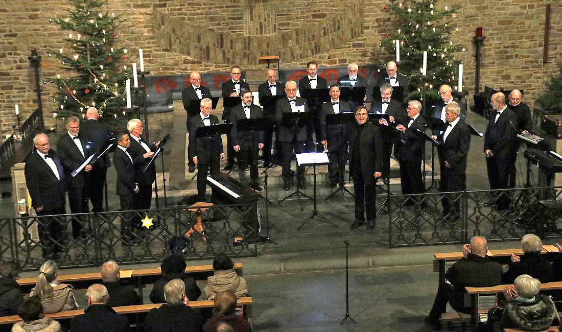 Der Quartettverein „Die Räuber“ aus Gummersbach führte in der katholischen Montfortkirche Marienheide sein traditionelles Weihnachtskonzert durch. Nach einer kurzen Ansprache des 1. Vorsitzenden Bernd Tokarski-Himmel und einer Schweigeminute für die Opfer des Anschlages in Magdeburg, begann das Konzert mit Kreiskantorin Dr. Annemarie Sirrenberg an der Orgel mit dem Prelude und der Fughetta von John Stainer. Es folgten vom Chor gesungene Lieder wie „Macht hoch die Tür“, „O Heiland reiß die Himmel auf“ und „O selige Nacht“. Der Block des Auftritts wurde beendet mit „Es ist ein Ros entsprungen“, „Dem großen Gott sei Ehre“ und „In dulci Jubilo“.