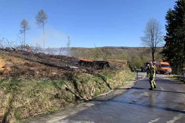 Insgesamt 3.000 Quadratmeter gerodeter Waldfläche und mehrere Holzpolter standen bei Eintreffen der ersten Kräfte in Brand. Laut Einsatzleiter Christoph Dick, Chef der Feuerwehr Reichshof, wurde das Feuer inzwischen unter Kontrolle gebracht, obwohl sich die Wasserversorgung schwierig gestaltete. „Der nächste Hydrant ist weit weg und die Fischteiche in der Nähe sind leer“, berichtete Dick. Deshalb wurde ein Pendelverkehr nach Brüchermühle, wo die Tanklöschfahrzeuge das Wasser aufnehmen, eingerichtet.