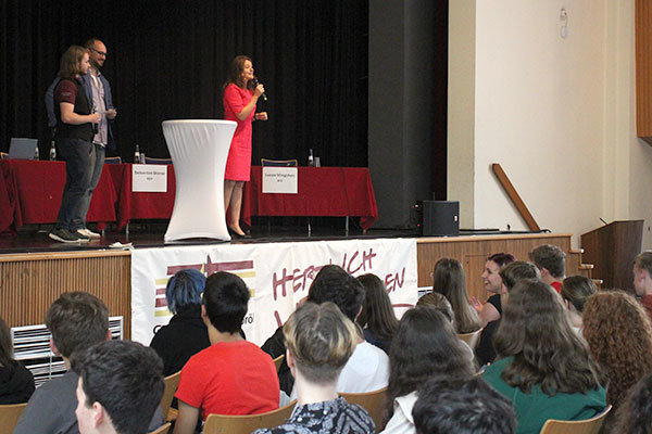 Die Bürgermeisterin durfte sich als erste dem Plenum vorstellen. Neben den gut vorbereiteten Pulster und Dohm durften natürlich auch die Schülerinnen und Schüler Fragen stellen, entweder selbst oder sie notierten ihre Anliegen und übergaben an Alisa Beumer und Lilly Marie Sophie Kratz, die mit ihrem Mikro einige Meter machte an diesem Nachmittag. Viele von den anwesenden Jugendlichen werden am Sonntag das erste Mal ihre Stimme abgeben.
