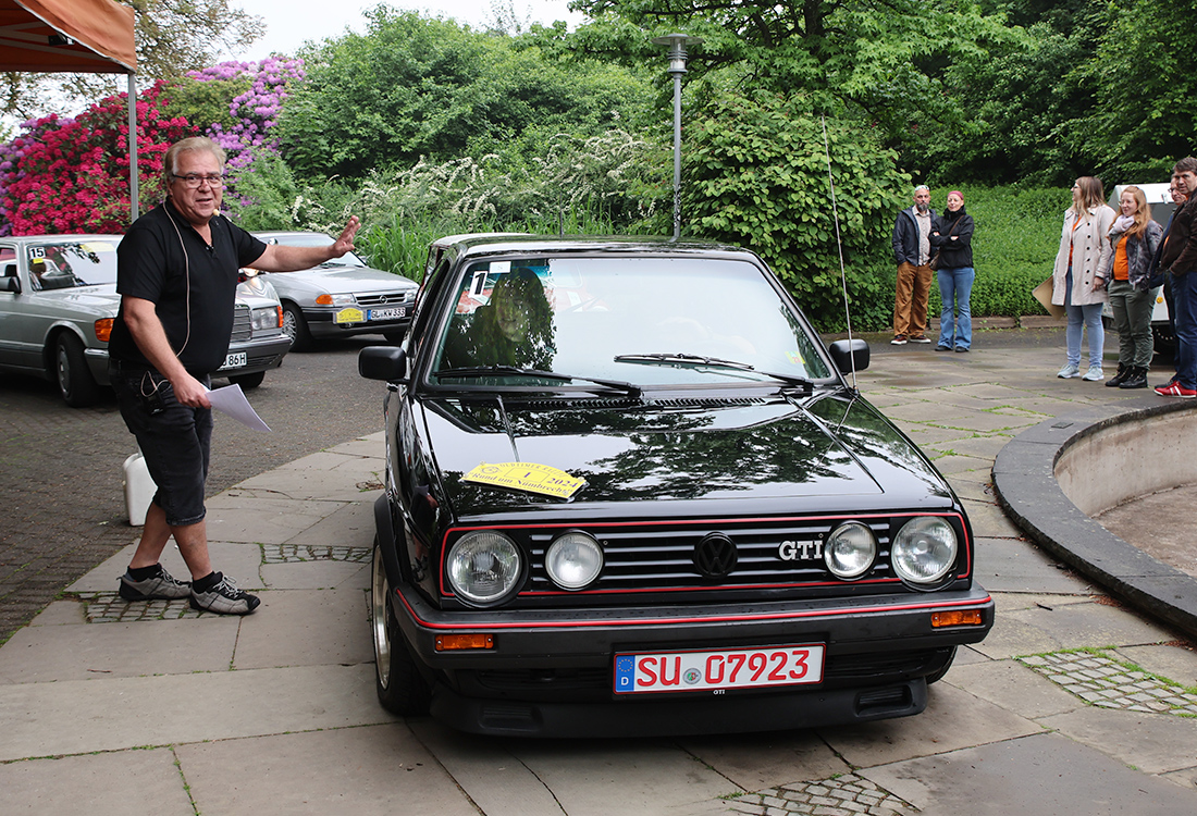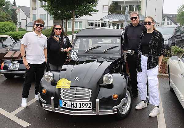 Miriam Kuhlmann-Barf fährt mit ihrem Mann Jörg einen Citroën 2CV mit „sagenhaften“ 29 PS, Baujahr 1986. Das Besondere an dem Auto ist sein verzinkter Rahmen. „Den finden wir besonders toll, da der Rahmen die große Schwachstelle der Ente war, der schnell durchrostete und schließlich durchbrach“, so die Schwester des Vorsitzenden des MSC. Auf die Frage, ob sie auch bei Regen mitgefahren wäre, hatte sie nur eine Antwort: „Ich fahr den Wagen tatsächlich jeden Tag zur Arbeit und er fährt auch bei Regen, Schnee und Sturm. Ich finde es cool und fahre total gerne das Auto und fände es schade, wenn er nur in der Garage stehen würde.“ Heute hatte das Ehepaar aus Nümbrecht-Stockheim noch zwei weitere Familienmitglieder im Wagen. „Da merkt man doch, dass man zu viert unterwegs ist. Bergauf wird es schon ein bisschen langsamer, das holen wir bergrunter dann wieder auf“, schmunzelte sie.