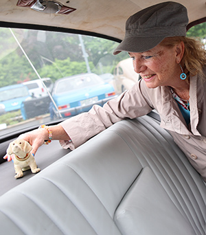 [Ohne Wackeldackel fährt Karin Rechenberger nicht mit ihrem 220 SE.]