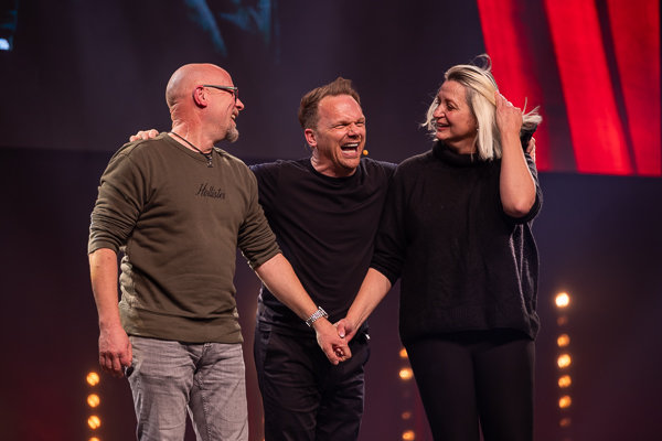 So erging es am Freitag auch Sandra und Sascha Krauß aus Dümmlinghausen. Beide sollten auf der Bühne mit dem Publikum einen bestellbaren Gegenstand und ein Adjektiv finden und verknüpfen, ohne dass Schmitz beide Wörter hören konnte. Im Anschluss improvisierte er, dass er dieses Geschenk Sandra schenken und gleichzeitig erraten musste. Wie er diese Aufgabe unter viel Lachen und Szenenapplaus des Publikums meisterte, sei an dieser Stelle nicht verraten. Nur „glitzerndes Katzenfutter“ zu erraten, verlangte Schmitz einiges ab. Sandra und Sascha erzählten uns im Anschluss, dass sie sich keinen Augenblick unwohl gefühlt hätten, auch wenn sie zunächst sehr unsicher gewesen wären, was da auf sie zukomme. Sandra führt aus, dass sie sich in der ersten Reihe außen links vermeintlich „sicher“ gefühlt habe, bis Schmitz auf sie zukam und sie mit auf die Bühne nahm. Dort habe sie Schmitz jedoch so empathisch und warm begleitet, dass sie jeden Moment genießen konnte. Ehemann Sascha ergänzt, dass er Schmitz als äußerst „warmherzigen, witzigen Menschen mit einer großen Auffassungsgabe“ im Fernsehen empfunden habe und die Realität diesem Bild in nichts nachstünde.