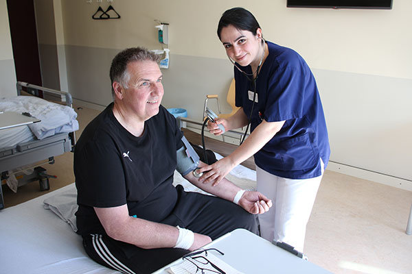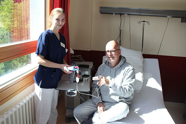 Das gilt explizit auch für alle Profis, die an dem Projekt teilnehmen, von den Fachpflegekräften bis zum Chefarzt PD Dr. Vedat Tiyerili. „Keiner kannte die Schüler, man musste also zunächst sehen, was man ihnen zutrauen kann“, blickt Schütter zurück auf die ersten paar Tage. „Wir sind auch froh, dass die Fachkräfte da sind“, meint Kiara. Wobei sich die erfahrenen Kollegen inzwischen immer mehr zurücknehmen können und in die Beobachterrolle wechseln konnten, sagt auch die Anleiterin Nicole Wurzbacher. „Ich war positiv überrascht, wie schnell das gut funktioniert hat. Die Azubis gehen sehr verantwortungsbewusst mit den Patienten um.“ Und ist mal wer unsicher oder es läuft nicht, wie es soll, greift sie unterstützend ein, erklärt die Vorgänge, sodass die Schüler es selbst schaffen.